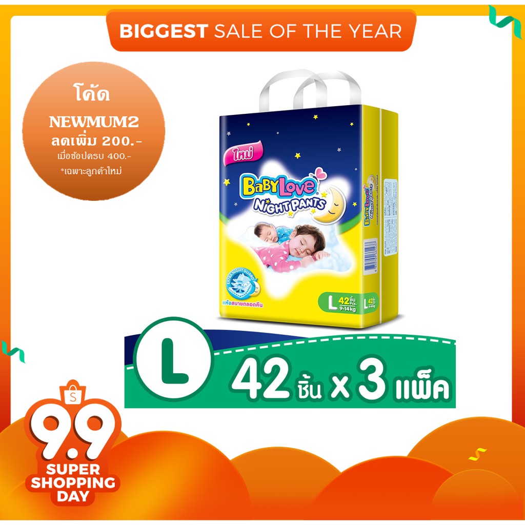 - ชื่อสินค้า BABYLOVE NIGHT PANTS กางเกงผ้าอ้อม เบบี้เลิฟ ไนท์แพ้นส์ ขนาดจัมโบ้ ไซส์L (42ชิ้น) x 3แพ็ค